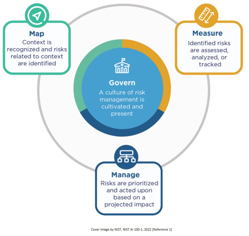 - The Fourfold Strategy – GOVERN, MAP, MEASURE, and MANAGE: This comprehensive strategy is essential for navigating the entire AI lifecycle. It underscores the importance of a structured approach in managing AI risks, where each stage, from governance to management, plays a critical role in ensuring the responsible development of AI systems.