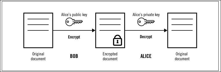 Figure 4. In this diagram, Alice and Bob generate public/private key pairs and use them to encrypt and decrypt messages.