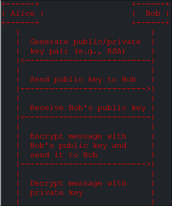 Asymmetric key exchange involves two parties, Alice, and Bob, exchanging public keys to encrypt and decrypt messages. Here’s a simple diagram illustrating this process: