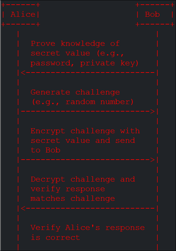 Figure 5. In this diagram, Alice proves to Bob that she knows a secret value without revealing the value itself. Bob generates a challenge (e.g., a random number), and Alice encrypts it with her secret value and sends it back to Bob. Bob then decrypts the response and verifies that it matches the challenge.