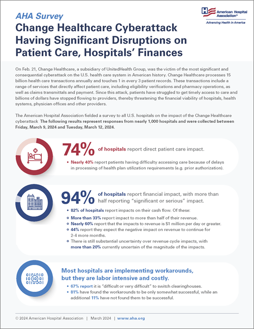 - American Hospital Association. (2024, March 20). Congress urged to help hospitals impacted by Change Healthcare cyberattack. Retrieved August 16, 2024, from https://www.aha.org/lettercomment/2024-03-20-congress-urged-help-hospitals-impacted-change-healthcare-cyberattack