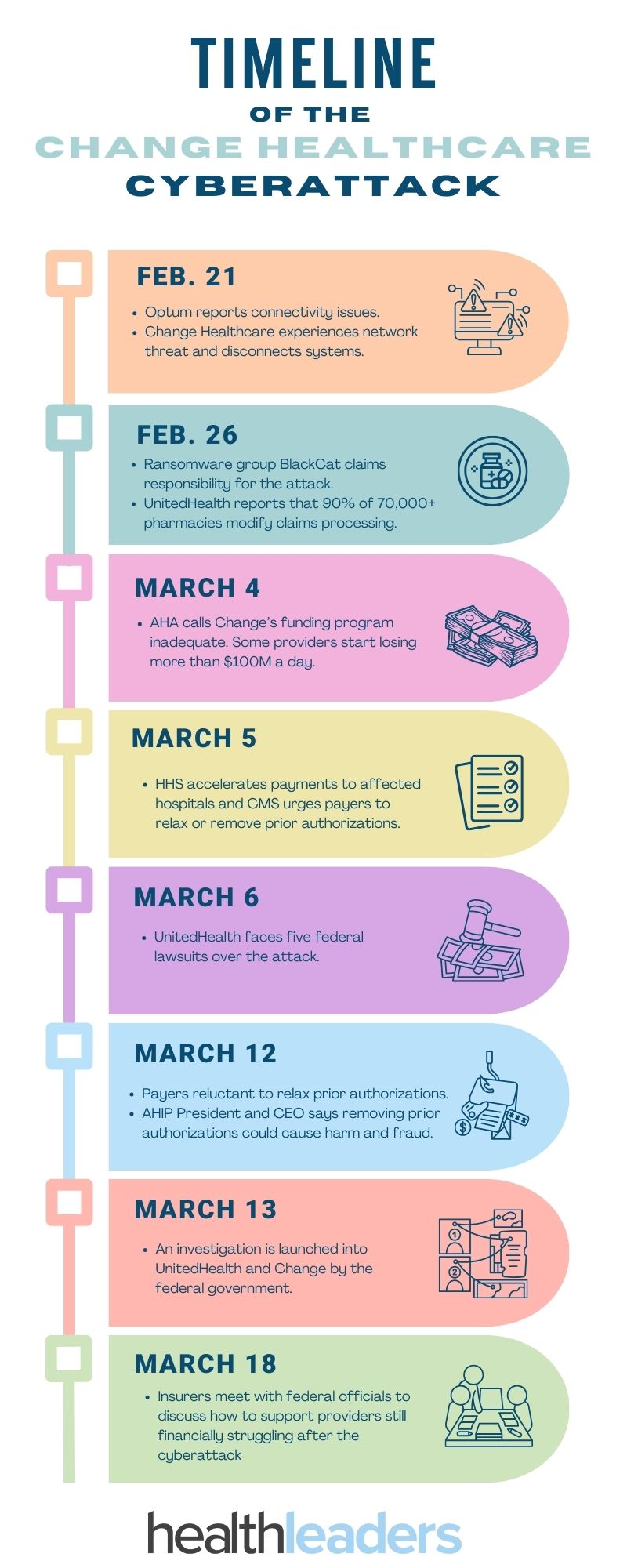 The cyberattack on Change Healthcare began on February 21, 2024, when UnitedHealth Group (UHG) disconnected Change Healthcare’s systems to mitigate the attack’s spread. By February 26, the ransomware group BlackCat claimed responsibility, stating it had stolen six terabytes of data. Change Healthcare confirmed the breach and began collaborating with cybersecurity firms and law enforcement to address the situation 1.
